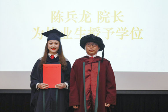 Dean Chen Binglong announced the university’s decision to confer master’s and doctoral degrees. Then he shook hands, presented the graduation booklet and took a photo with every graduate.