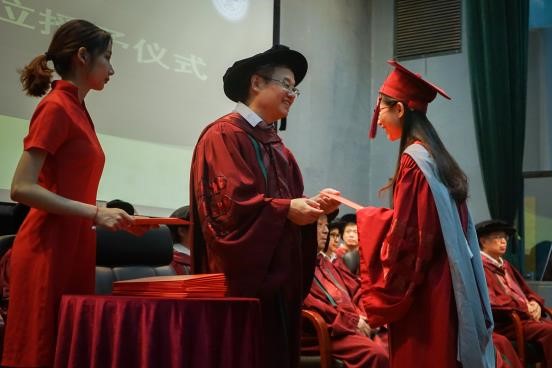 Secretary Zhao Yong announced the university’s decision to confer doctoral and master’s degrees. Dean Zheng Limin conferred degrees. He turned the tassel, presented a graduation booklet and shook hands with every graduate.