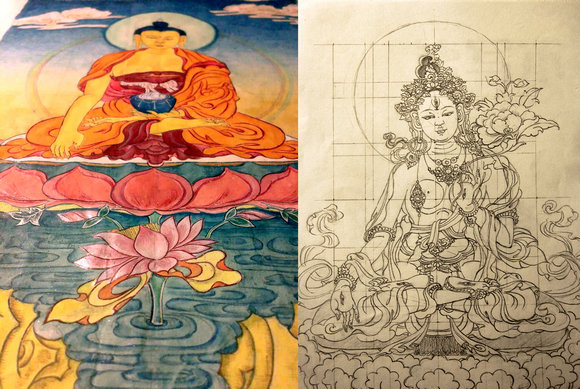 The thangka, a kind of religious painting in Tibetan Buddhism drawn by Zhu Lin