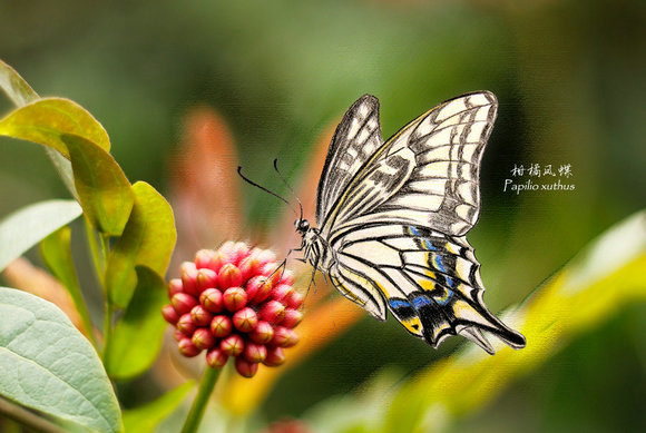 The scenic photo behind the papilio xuthus is taken by Zhu Lin herself during her college years at SYSU