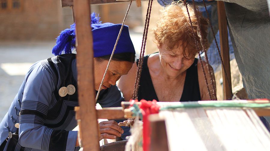 A foreign tourist experiences the Hani culture.