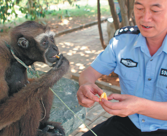 Forest police officer Dong Jianchuan feeds a Skywalker hoolock gibbon at the Dehong Forest Police Station in Dehong, Yunnan, in April 2011. XINHUA