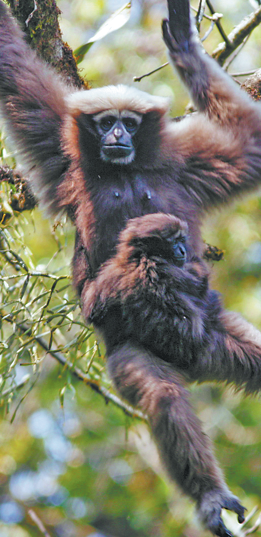 A young Skywalker hoolock gibbon holds on to its mother at the reserve in May 2021. XINHUA