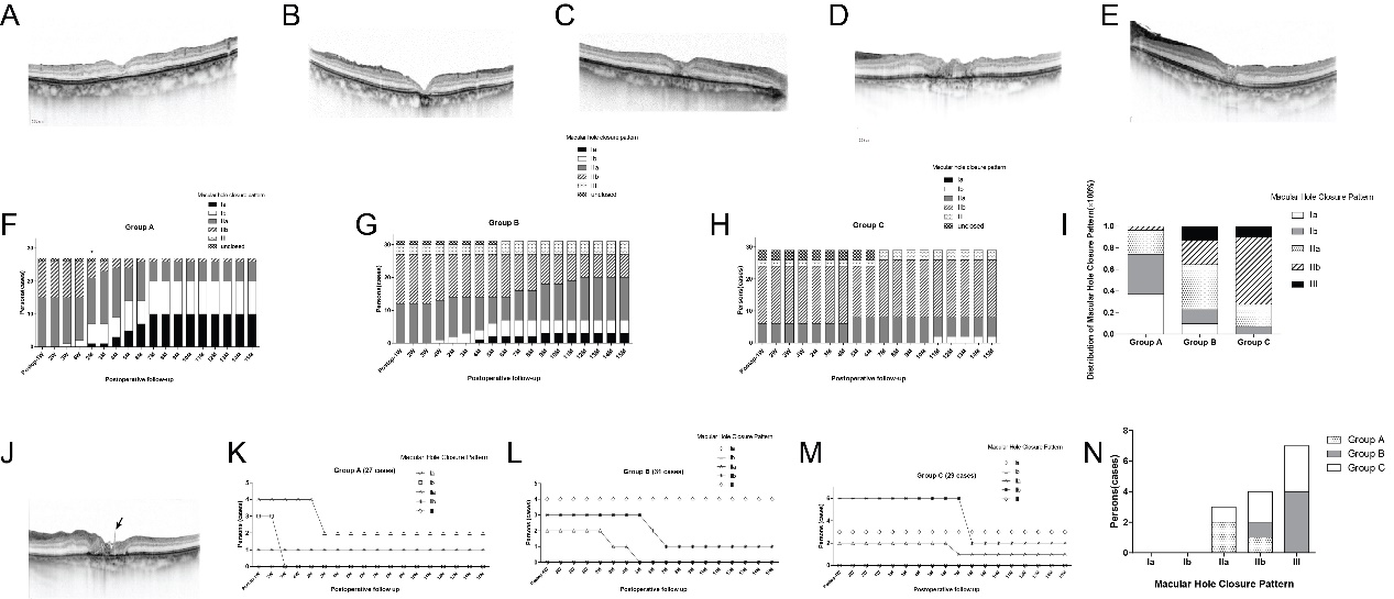 The team also found that the macular hole closure pattern improved continuously and differed significantly in three groups (Fisher’s exact test, p<0 .05) (group a, hole diameter of 900–1,000 μm; group b, hole diameter of 1,000–1,100 μm; and group c, hole diameter of over 1,100 μm). type i closure pattern was probably attained in cases of hole diameter less than 1,000 μm, and for those of hole diameter over 1,000 μm, type ii closure pattern was most commonly seen, with a few type iii closure pattern appeared.
