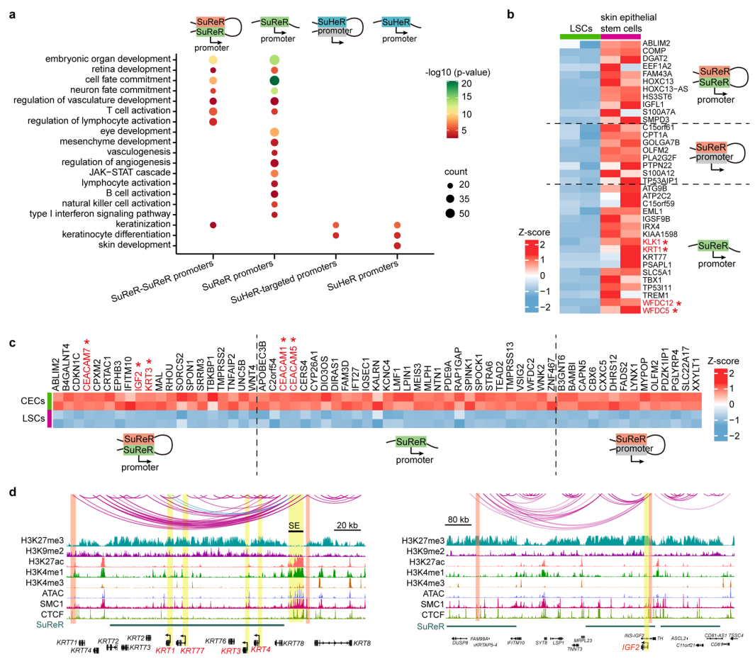 The inactive genome regions with exceptionally high densities of H3K27me3 or H3K9me2 are defined as super-silencers. These super-silencers maintain corneal epithelial identity and repress disease-associated genes through chromatin interactions and/or proximity (Figure 2).