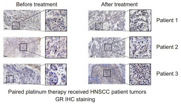 GR immunohistochemical staining in tumor tissues of matched head and neck cancer patients collected before and after platinum treatment. The figure shows a representative GR-stained image of the tumor of a patient with head and neck cancer