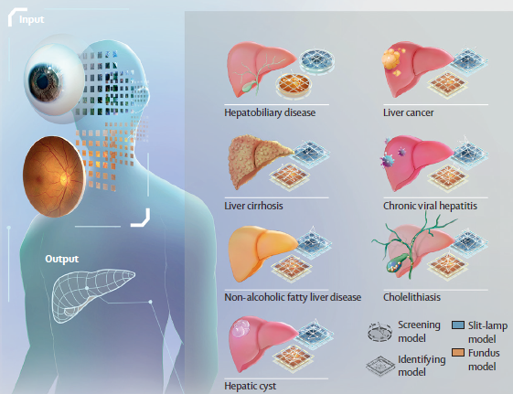 The research team successfully extracted the ocular features of hepatobiliary diseases from these imaging data via deep learning using slit-lamp and fundus images, and developed and tested 14 models (seven slit-lamp models and seven fundus models). The models can be used to screen for hepatobiliary diseases and identifying six categories of hepatobiliary diseases, including liver cancer, liver cirrhosis, chronic viral hepatitis, non-alcoholic fatty liver, cholelithiasis and liver cyst. The models achieved good performance in the diagnosis of severe liver diseases such as liver cancer and liver cirrhosis and relatively poor performance in milder disease such as chronic viral hepatitis, non-alcoholic fatty liver, cholelithiasis and liver cyst. These models have been successfully deployed on the intelligent diagnosis prediction cloud platform of Zhongshan Ophthalmic Center, Sun Yat-sen University, which could be applied as a big scale opportunistic screening tool.