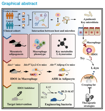 Mechanistically, the researchers analyzed the snRNA dataset and established adipocyte-specific aryl hydrocarbon receptors (AHR) knockout mice model. They verified that L-kynurenine from macrophages mediate the mesenteric adipogenesis by AHR in adipocytes. Based on these findings, the researchers further observed that administration of an IDO1 inhibitor or bacteria engineered to degrade L-kynurenine alleviates mesenteric adipogenesis in mice.