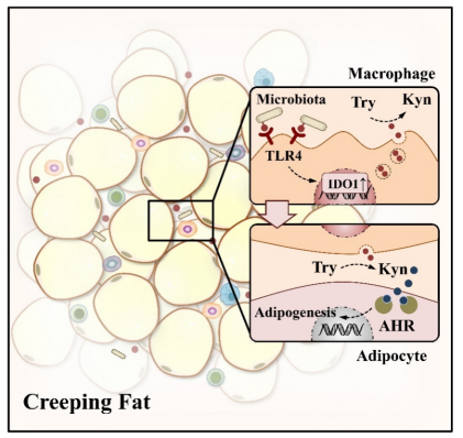 Subsequently targeted metabolome analysis revealed that L-kynurenine was the most enriched metabolite in CrF. L-kynurenine is converted from tryptophan via the key rate-limiting enzyme indoleamine 2,3-dioxygenase 1 (IDO1). Leveraging single-cell RNA (scRNA) sequencing of mouse mesenteric tissues and macrophage-specific IDO1 knockout mice, the researchers demonstrated that up-regulation of IDO1 in macrophages enhanced the synthesis of L-kynurenine and drove the mesenteric adipogenesis.